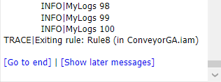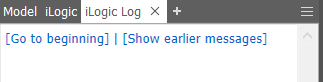 | After you clear messages from the panel, navigation links display at the top of the panel if older messages are available. | The iLogic Log panel is limited to displaying 20,000 messages at one time. When over 20,000 messages are entered, navigation links at the bottom of the panel allow you access messages created after reaching the 20,000 limit. |