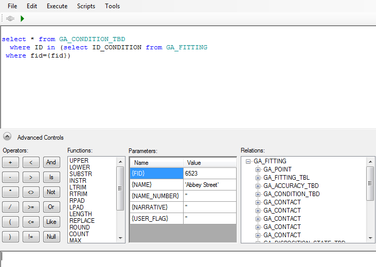 - Select a feature class in the tree view, and click to insert the select statement that retrieves the related value into the expression input box.
