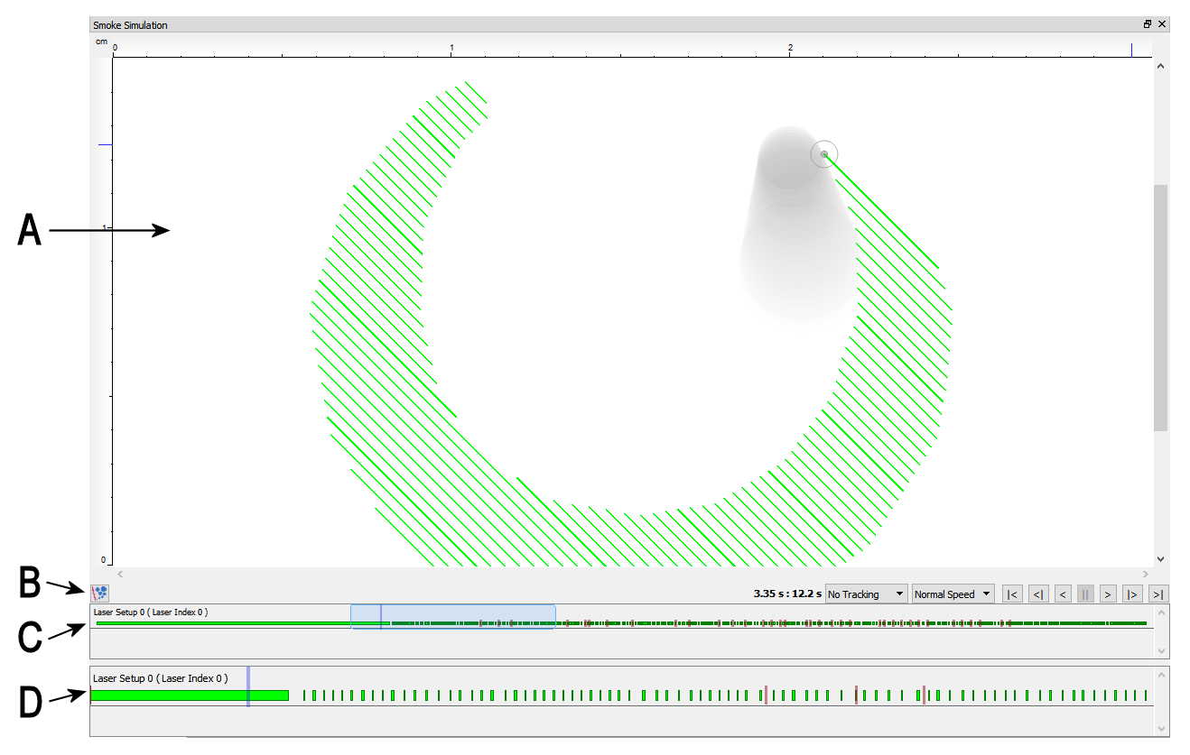 In area C and D, the activity periods for each laser are drawn. Also, the current position on the timeline is indicated by a semi-transparent vertical line (in darker highlight color, e.g. C2 in area C). When a laser-smoke collision is detected, then a semi-transparent red line is drawn at the end of the related time interval (the collision is also indicated in the 2D visualization A).