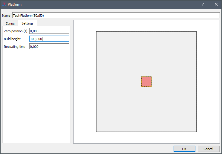 General platform settings can be found on the Settings tab. The platform's Zero Position (in millimeters), the maximum Build Height (in millimeters), and the Recoating Time (in seconds) can be parameterized there.