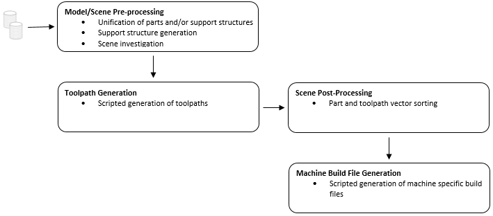 Since toolpath generation is model specific, we only have information about one (the current) model and not about the whole build platform. This is a good place to group toolpath geometry to "packages" (bsHatchBlocks within a bsHatch instance), which won't get split up any further later in the post-processing step, and to add special processing flags and parameters (i.e. toolpath source information, which won't be available any more in the post-processing step).