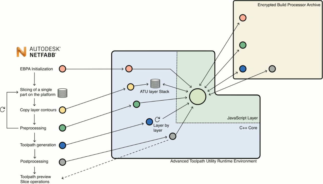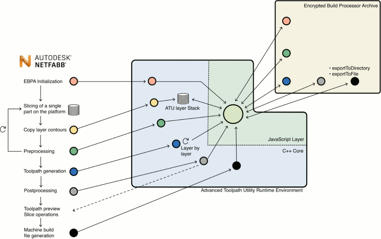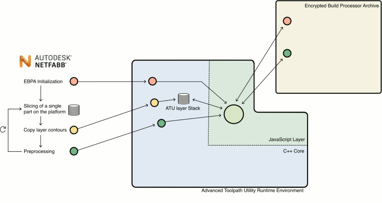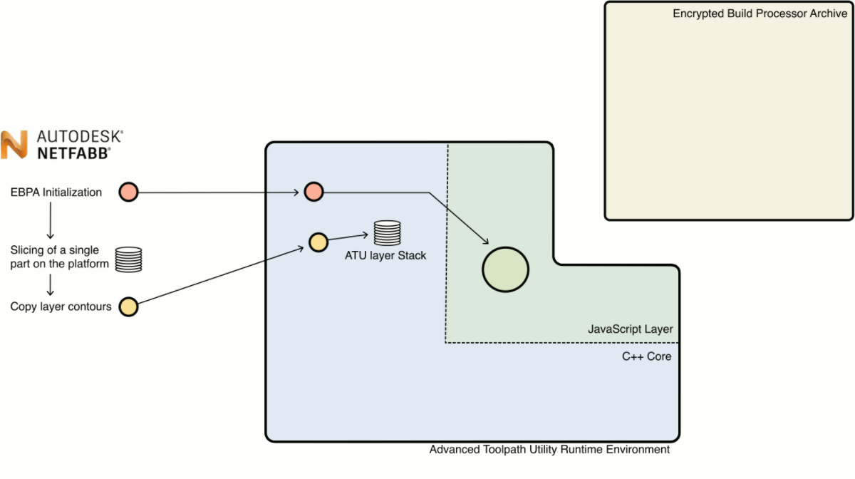 With the ability to change layer contour data and to create toolpaths and machine buildfiles, the ATU build processor can be used for various tasks. To ensure a consistent behavior across different host applications (eg. Autodesk® Netfabb®), a strict integration workflow for host applications was set up to guarantee identical processing results. It is important for every ATU developer to be aware of this workflow, because it influences operation order and data management of ATU JavaScript projects: