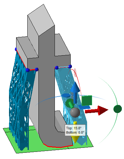 This spawns the angle control gizmo halfway along the overall support height, displaying the angles from the vertical for both sections, above and below the knee.