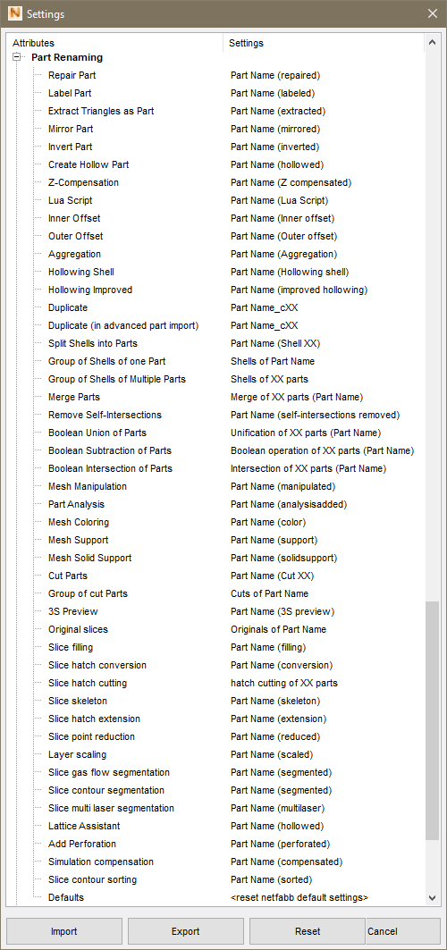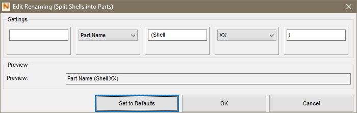 The part renaming specifies the name applied to parts after they are modified, or more accurately, to the parts generated by those modifying actions. The name of the original is always part of the new name. To change renaming settings, double-click on a function in the list, or click on the button ..." which appears to the right of the function after you click on it once. A dialog appears to change the automatic renaming. You can insert what is added before or after the part name in the text fields left and right of part name. Below, you can see a preview of how your parts are named. "Part name" always refers to the name of the original part. With the button Set to defaults at the bottom of the dialog, you restore the default naming for that particular function. The default setting for repaired parts, for example, is that (repaired) is added to the original part name.