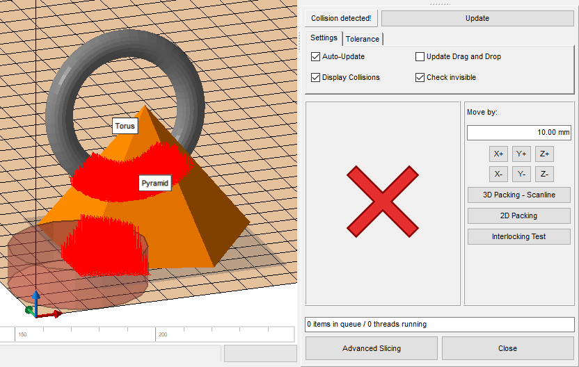 Collision detection checks whether any individual parts in the project touch or overlap with each other or with no-build zones. It is also launched automatically when using the packers.