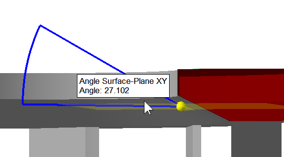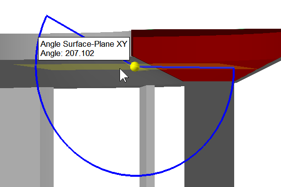 Netfabb may not have given you the best arc for your measurement of the downskin angle. Choose a suitable arc by moving the mouse pointer around the angle's apex, marked by the yellow bubble. Once you have found the desired arc, click once more to select it and finalize this angle measurement.