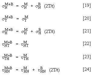 The calculation of these stresses involves several steps. We begin by recasting the six global stress tensors in the local coordinate system dictated by the stress classification line (SCL). We then integrate the six local stress tensors, σN, σT, σH, τNT, τTH, τHN, along the SCL to obtain the total load (FN, FT, FH, FNT, FTH, FHN) using: