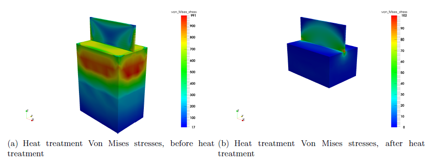 Observe the stresses reduce as the temperatures increase. Then as the heated part is slowly brought back to room temperature, new thermal stresses are introduced. Looking at the Von Mises stresses in Figure 5, the final, room temperature part has peak stresses that are 90% of the peak stresses prior to heat treatment. This achieves the goal of removing 90% of the stresses induced by the LPBF construction process by the means of stress relief heat treatment.