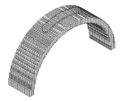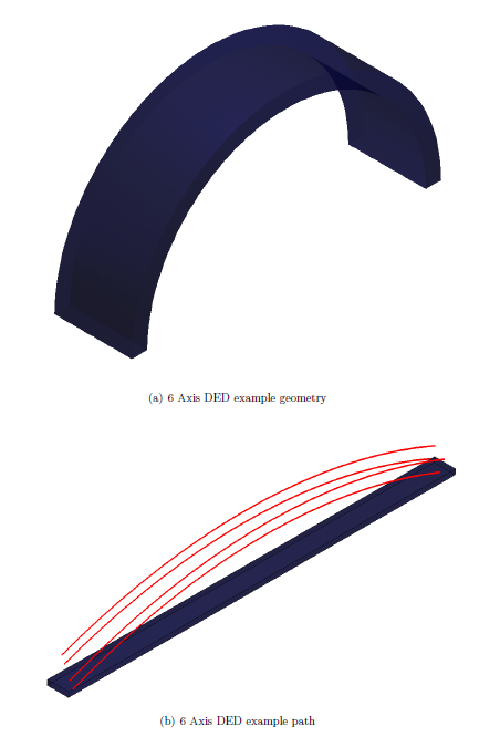 This example simulates the 6-Axis Directed Energy Deposition (DED) construction of a 2-bead wide, 3-layer high Ti-6Al-4V component on a radial Ti-6Al-4V component. The radial component is shown in Figure 1(a), while the laser path is shown in Figure 1(b) upon a generic substrate.