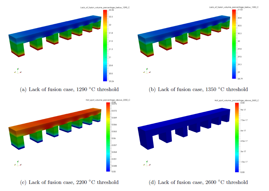 For this case, which intentionally used low heat input processing parameters, there is clear indication of lack of fusion problems. The minimum lack of fusion volume percentage for the 1290° C temperature is 20.3%. This indicates that more than 20% of the deposited volume does not even reach the solidus temperature, indicating there will be significant lack of fusion. The 1350° C check shows that over 28% of the build volume does not fully melt. This could cause lack of adhesion or build failure early on in the production of this part. Overheating is not an issue with this set of processing conditions, as a negligible portion of the build volume exceeds 2200° C, and none of the part reaches 2600° C.