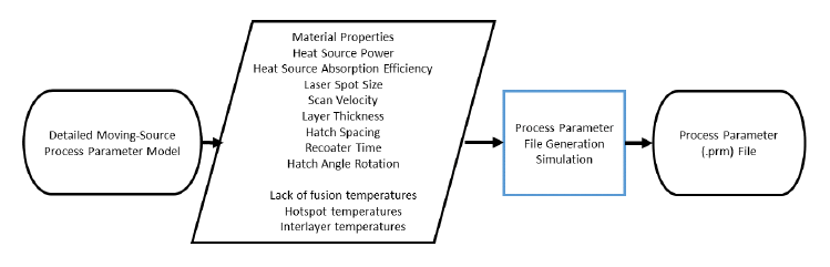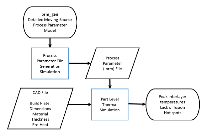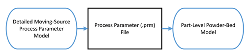 For each new set of process parameters, the user must generate a PRM file. The PRM file is an input into the part-level analysis that accounts for changes in the deposition settings. This type of analysis need only be run once for each set of parameters. Once the PRM file is generated for a set of parameters, it can repeatedly be used as an input into the part-level analysis. Figure 2 illustrates the workflow.