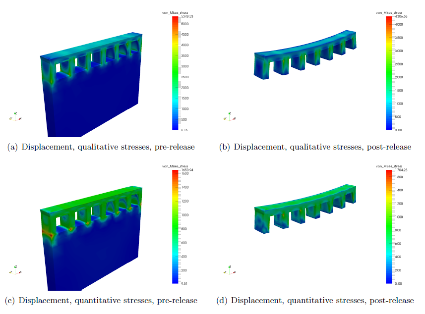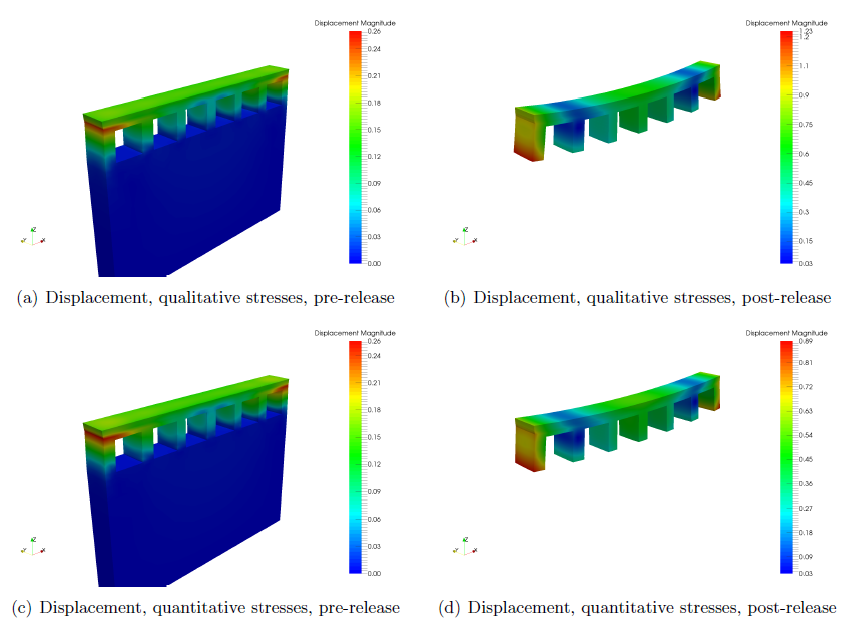 Observe that pre-release distortions are roughly equivalent for the two cases. However, post release, the quantitative stress case exhibits displacements that are 28% less than without using plasticity. This shows the necessity of accounting for this behavior when looking at post-EDM builds that do not undergo heat treating.