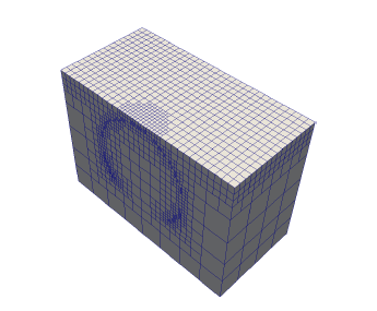 A time incremental thermal analysis is performed first to compute the temperature history of the part. Layers are activated in groups using *PBPA, and additional time increments are used to model heat conduction into the part. The first thermal analysis includes only the part and substrate, with heat loss into the powder being modeled as convection with a value of 25.d-6 W/((mm2)°C) using *CONV. The second thermal analysis models the powder, part, and substrate. Convection boundary conditions are applied at the surface of the powder and substrate surface, also with a value of 25.d-6 W/((mm2)°C).