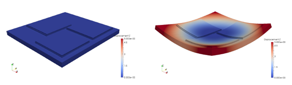 Figure 2 shows the computed final distortion at three times: before the build plate is removed from the machine, after the build plate is removed from the machine, and after the part is removed from the build plate. Distortion is in mm with 5X magnification.