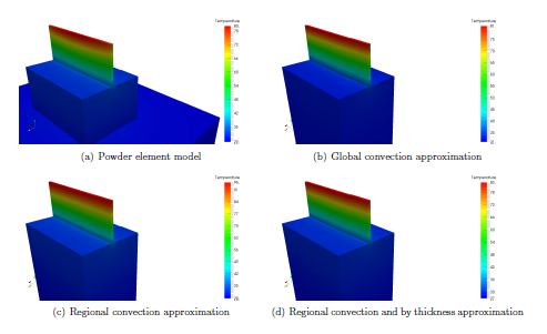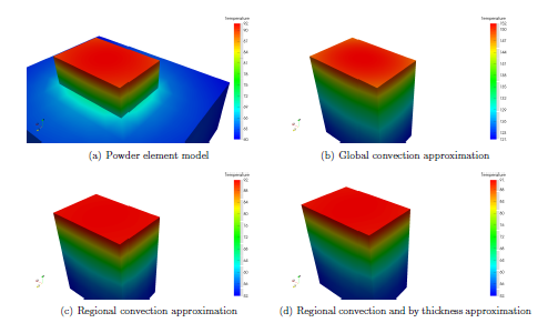 At this time step, the global convection value does match with the powder case very well. However the regional case, while very accurate for the thick section, allows the top section of the part to get hotter than the powder case predicts. Using the thickness-based convection corrects for this, bringing the temperatures very close to the powder case for both the thick and thin sections, while taking roughly 1/3 as long to complete.