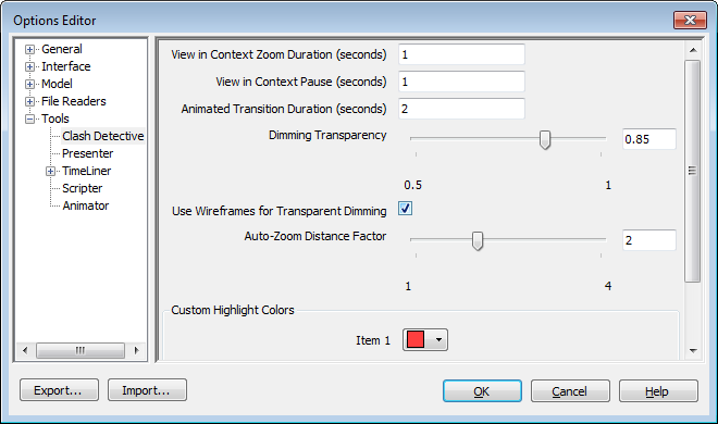 Use the Animated Transition Duration box to enter the required value. When you click on a clash in the results grid of the Clash Detective window, this value is used to smooth transitions from the current view to the next.