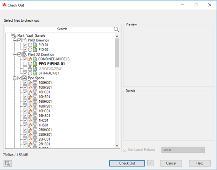 The new Get / Check Out dialog box also shows vault status. str-building above is checked-out by another user. ppg-piping-01 is already checked-out to you. And str-rack-01 is available for check-out.