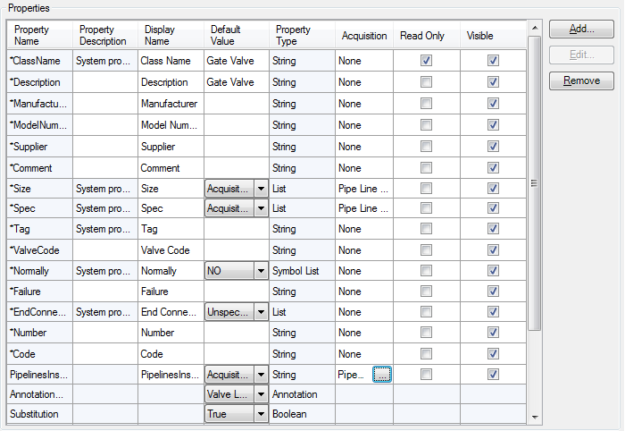 Properties can acquire values from other components or lines to which they are directly related, as, for example, a valve is related to a pipe line. The valve size could be acquired from the pipe line size, in this case.