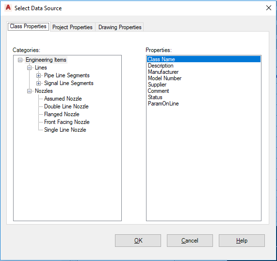 The Select Data Source dialog box displays three tabs that allow you to select a property as a source for the acquired property value. You can choose from a class, project, or drawing property.