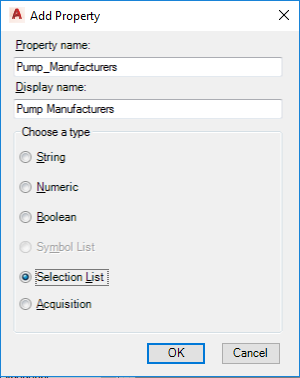 - Under Property Name, enter a name for the new property (for example: Pump_Manufacturers). The name cannot contain any spaces.