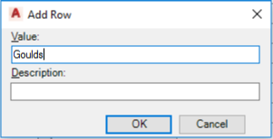 - In the Add Row dialog box, enter the new value (for example: Goulds) and a description of the value, if necessary.