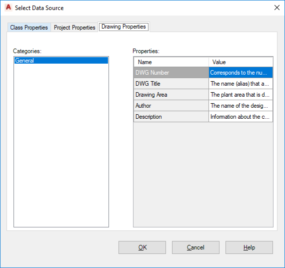 Displays a list of the drawing properties you can select as the data source.