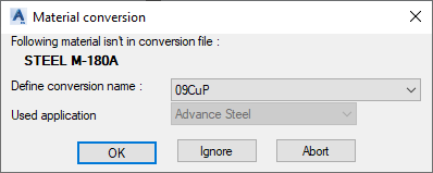 The dialogs for material and section conversion open if the extension cannot automatically assign materials and sections from Robot databases to materials and sections in Advance Steel databases. It results from differences in element names between databases in the source and target applications.