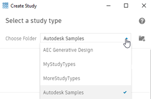 create a study using one of the Autodesk examples, in the Create Study dialog, for Choose Folder, select Autodesk Samples.