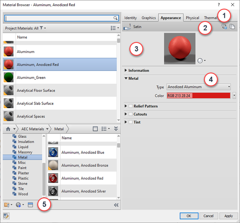 | 4 | Properties panel: Display and manage detailed properties of the selected asset. The asset name and description are displayed beneath the Information drop-down panel. This example above shows the Metal properties being displayed (expanded) for the "Anodized - Red" Appearance asset. The set of properties that are displayed for a liquid, for example, differ from the set of properties displayed for metal. |