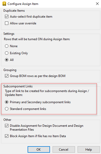 Control the link type for sub-components by configuring whether Primary and Secondary or Standard component links are used during an Assign Item or Update Item event.