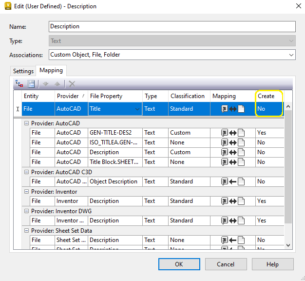 Autodesk recommends that the Create setting on the Mapping tab be disabled for properties you are mapping to AutoCAD Block attribute properties.