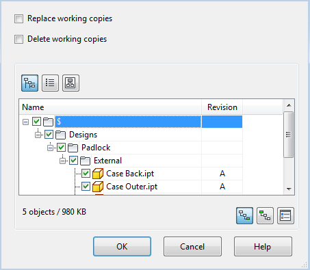 - In the Undo Check Out dialog box, specify if you want to replace the local file with the version currently stored in the vault and whether or not to delete the working copy of the file. Select Replace working copies to reset any changes that were made to the working copy of the file.