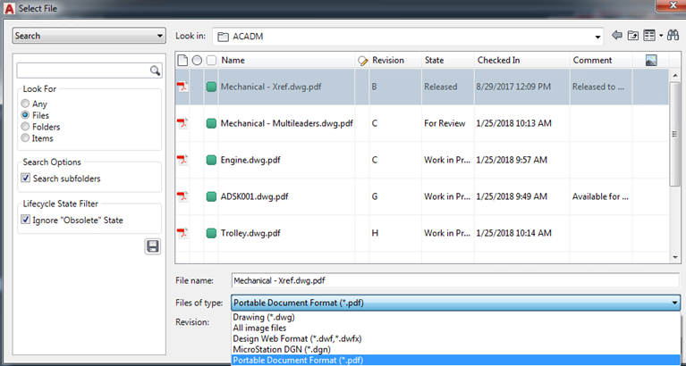 You can also attach PDF files from Vault directly. PDF file option is added in the Attach from Vault dialog to support PDF attachment to AutoCAD drawings.