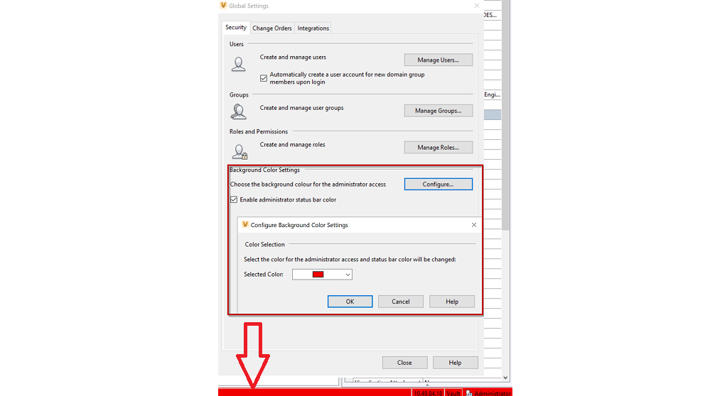 It is now easy to recognize if you access Vault as an administrator. Vault 2021 adds a new option in the Security tab of the Global settings dialog box to specify a background color in the status bar to indicate the administrator access.