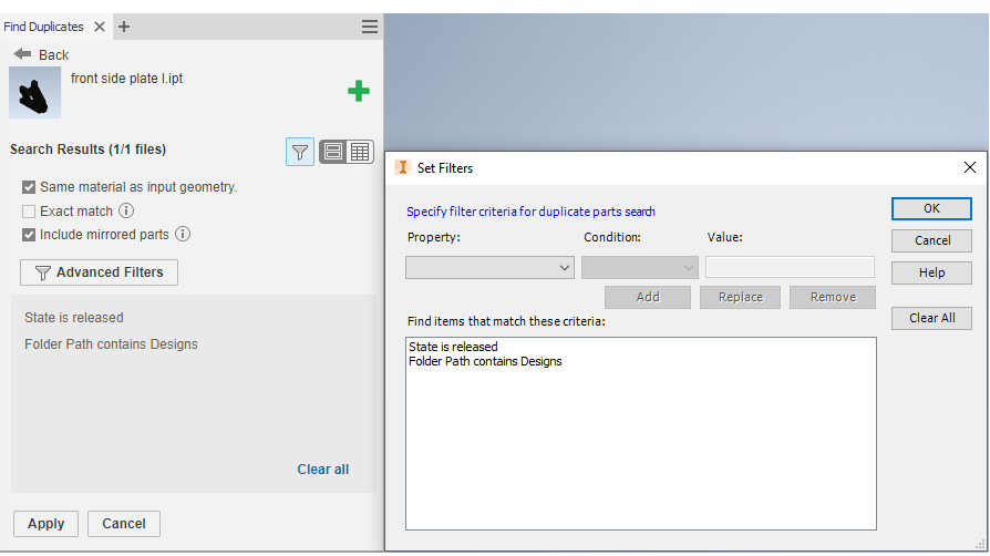 You are now able to filter duplicate search results in the Find Duplicates panel within Inventor.