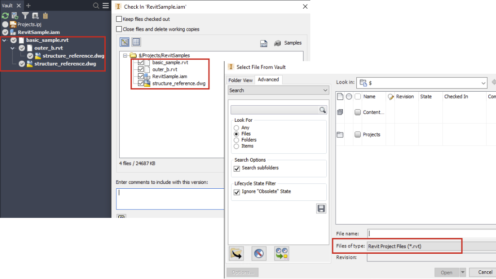 Add the Revit file type using the Open from Vault and Place from Vault dialogs.