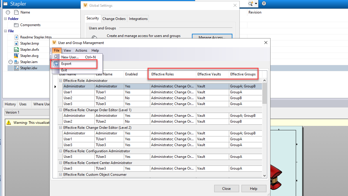 Export user/group profile information and see roles and vault access based on user and group assignments.