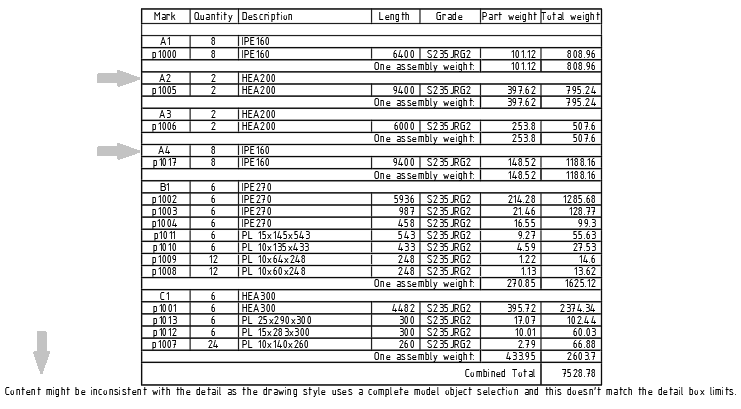In case of a partial overview that has been created using a drawing style using the Complete model or Complete model with Xrefs options in the Model objects selection (from the Drawing Style Manager), the bills of material created on this view will contain all the objects from the model, not only the ones included in the Detail box.