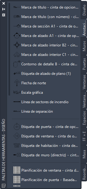 Las paletas de herramientas predeterminadas en el espacio de trabajo contienen herramientas de etiqueta de alzado de muestra que se pueden utilizar y personalizar según sea necesario. Además, en los catálogos siguientes facilitados con el software se incluyen herramientas de etiqueta de alzado que pueden agregarse a las paletas:
