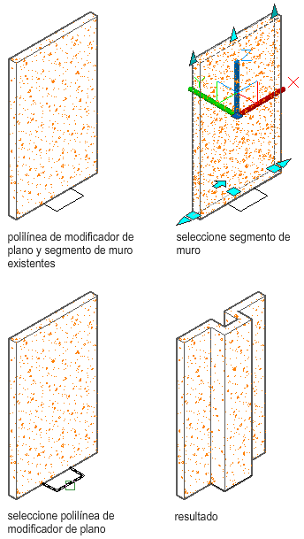 Utilice este procedimiento para crear modificadores de muro a partir de una polilínea abierta. Se puede dibujar la polilínea en la ubicación para el modificador de muro, o se puede proyectar el modificador creado sobre el muro. La polilínea no puede estar cerrada.