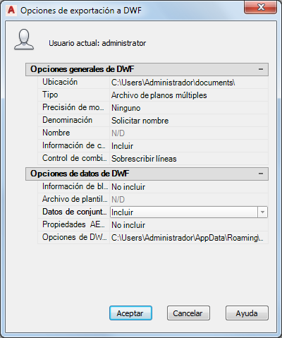 2. En el cuadro de diálogo Opciones de exportación a DWF/PDF, en Opciones de datos de DWF, para Propiedades AEC automáticas, seleccione Incluir y haga clic en Aceptar.