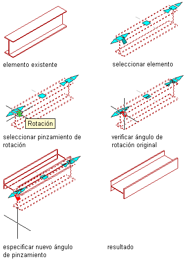 Utilice este procedimiento para cambiar la orientación de un elemento estructural en relación con su eje extruido especificando los grados que se deben rotar. Un valor positivo rota el elemento a la izquierda cuando se visualiza de su final a su principio.