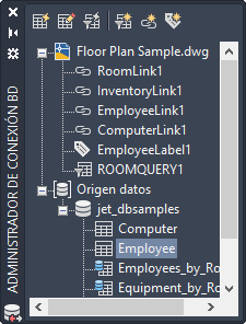 El Administrador de Conexión BD es una ventana fija cuyo tamaño puede variarse y que contiene una serie de botones y una vista en árbol. En el Administrador de conexiones a bases de datos, puede abrir el Visor de datos para ver y modificar las tablas de una base de datos. También se pueden asociar distintos objetos de base de datos (como plantillas de vínculos, de rótulos y consultas) con un dibujo.