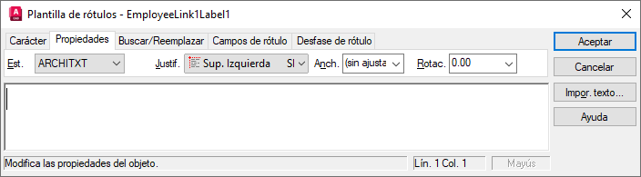 Aplica un estilo de texto al rótulo. El estilo actual se guarda en la variable de sistema TEXTSTYLE. El formato de carácter para el tipo de letra, la altura y los atributos negrita y cursiva se ignora si se aplica un estilo nuevo a una plantilla de rótulo ya existente. Los atributos de apilación, subrayado y color se mantienen en los caracteres en los que se aplica un nuevo estilo. No se aplican estilos con efectos cabeza abajo o hacia la izquierda. Si se aplica un estilo definido con un efecto vertical a un tipo de letra SHX, el texto se muestra en sentido horizontal en el cuadro de diálogo Plantilla de rótulos.