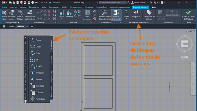 Si no se ha abierto la paleta de creación de bloques, haga clic en la ficha Editor de bloques > grupo Administrar > Paletas de creación. Buscar