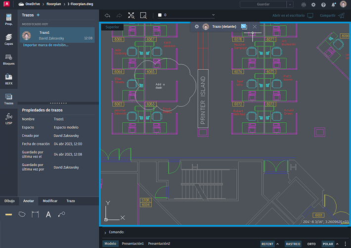 Trazo, disponible en las aplicaciones web y para dispositivos móviles de AutoCAD y los productos basados en AutoCAD a partir de la versión 2022, es una función de colaboración y adición de marcas de revisión que proporciona un espacio seguro para añadir cambios en un dibujo sin modificar el dibujo existente.