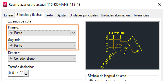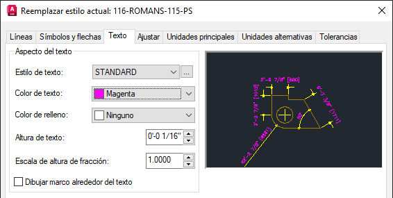 Los parámetros que eran modificaciones ahora son los parámetros por defecto para el estilo de cota 116-ROMANS-115-PS.