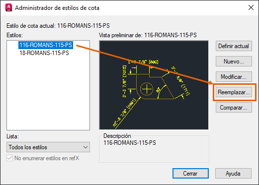Seleccione el estilo de cota 116-ROMANS-115-PS o las <modificaciones de estilo> que aparecen debajo de él.