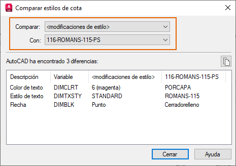 Nota: Puede utilizar Comparar para ver las diferencias entre dos estilos de cota. Solo tiene que seleccionar los estilos de cota que desea comparar en las listas desplegables.
