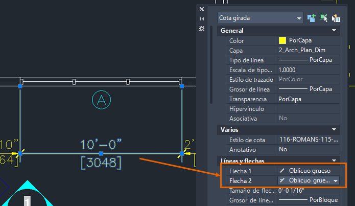 Cambie cualquiera de las propiedades de la cota. Por ejemplo, cambie el estilo de flecha a Marca arquitectónica.